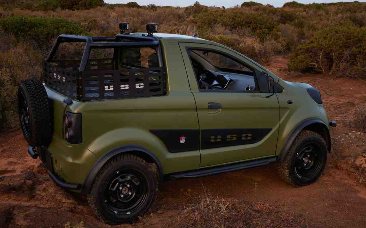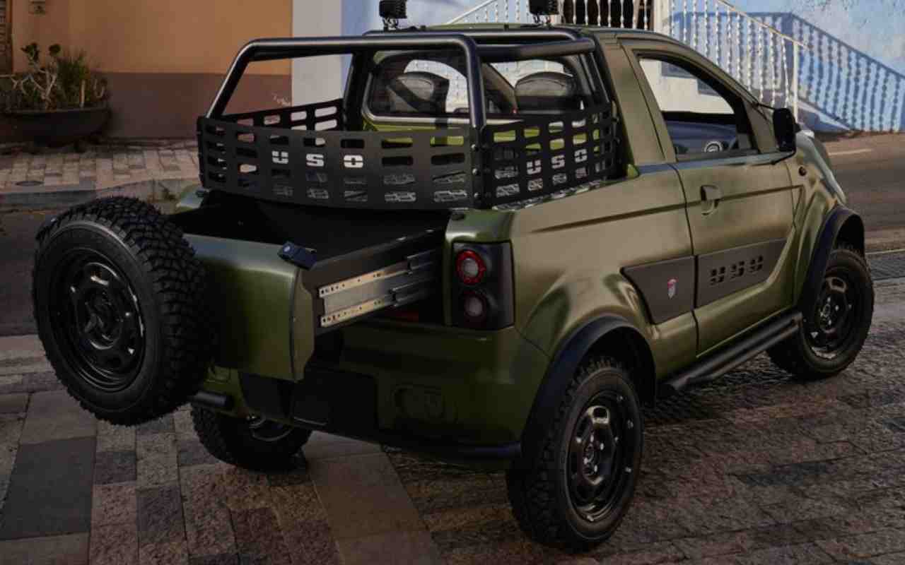 Il look dell’auto è molto fuoristradistico con roll bar, pedane laterali e protezione paracolpi, oltre ad un colore militare che esalta lo stile aggressivo. Per quanto sia lunga 3,17 m, questa vettura presenta un conformazione fuoristradistica con sedili ergonomici e poggiatesta integrati. Il motore elettrico è posizionato nella zona posteriore, mentre la carrozzeria ha per lo più componenti di produzione italiana.